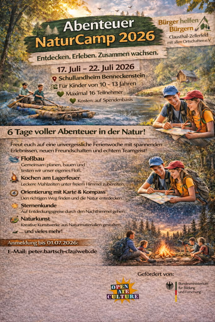 Sechs Tage voller Abenteuer, Naturerlebnisse und echter Gemeinschaft: Vom 17. bis 22. Juli 2026 veranstaltet der Verein Bürger helfen Bürgern Clausthal-Zellerfeld mit allen Ortschaften e.V. das „Abenteuer NaturCamp 2026“ im Schullandheim Benneckenstein. Unter dem Motto „Entdecken. Erleben. Zusammen wachsen.“ erwartet die teilnehmenden Kinder ein abwechslungsreiches Ferienprogramm mitten in der Natur.