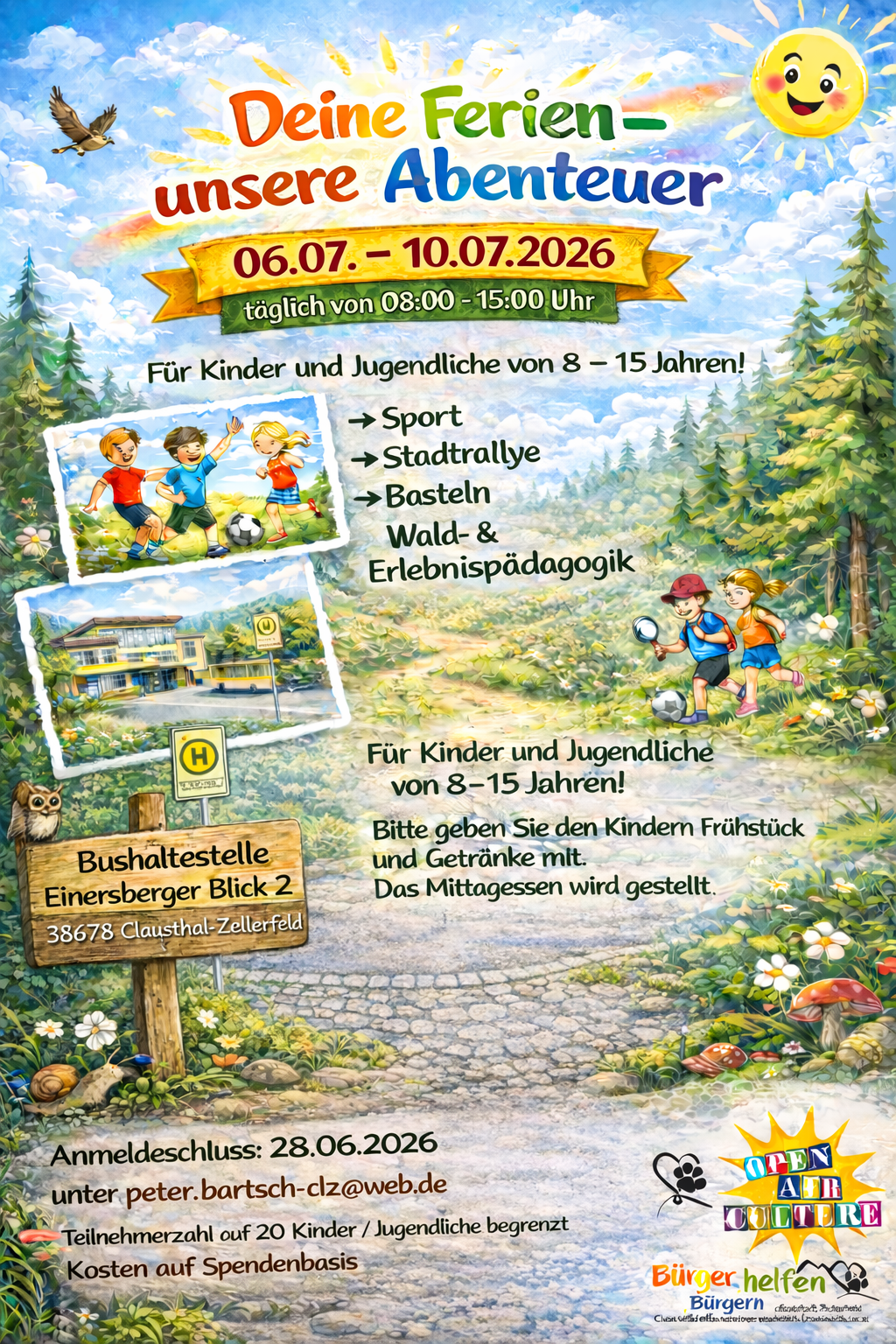 Unter dem Motto „Deine Ferien – unsere Abenteuer“ lädt der Verein Bürger helfen Bürgern Kinder und Jugendliche im Alter von acht bis 15 Jahren zu einer abwechslungsreichen Ferienwoche ein. Vom 06. bis 10. Juli 2026 erwartet die Teilnehmenden täglich von 8 bis 15 Uhr ein vielfältiges Programm mit Sport, einer spannenden Stadtrallye, kreativen Bastelangeboten sowie Wald- und Erlebnispädagogik.