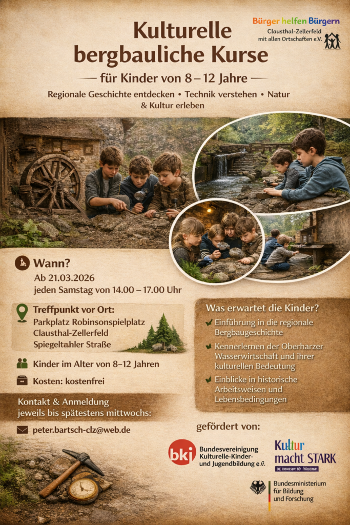 Der Verein „Bürger helfen Bürgern Clausthal-Zellerfeld mit allen Ortschaften e.V.“ bietet ab dem 21. März 2026 kulturelle und bergbauliche Kurse für Kinder im Alter von 8 bis 12 Jahren an. Die Kurse finden jeden Samstag von 14.00 bis 17.00 Uhr statt und sollen Kindern die Möglichkeit geben, die regionale Geschichte des Oberharzes auf spannende und praktische Weise kennenzulernen.