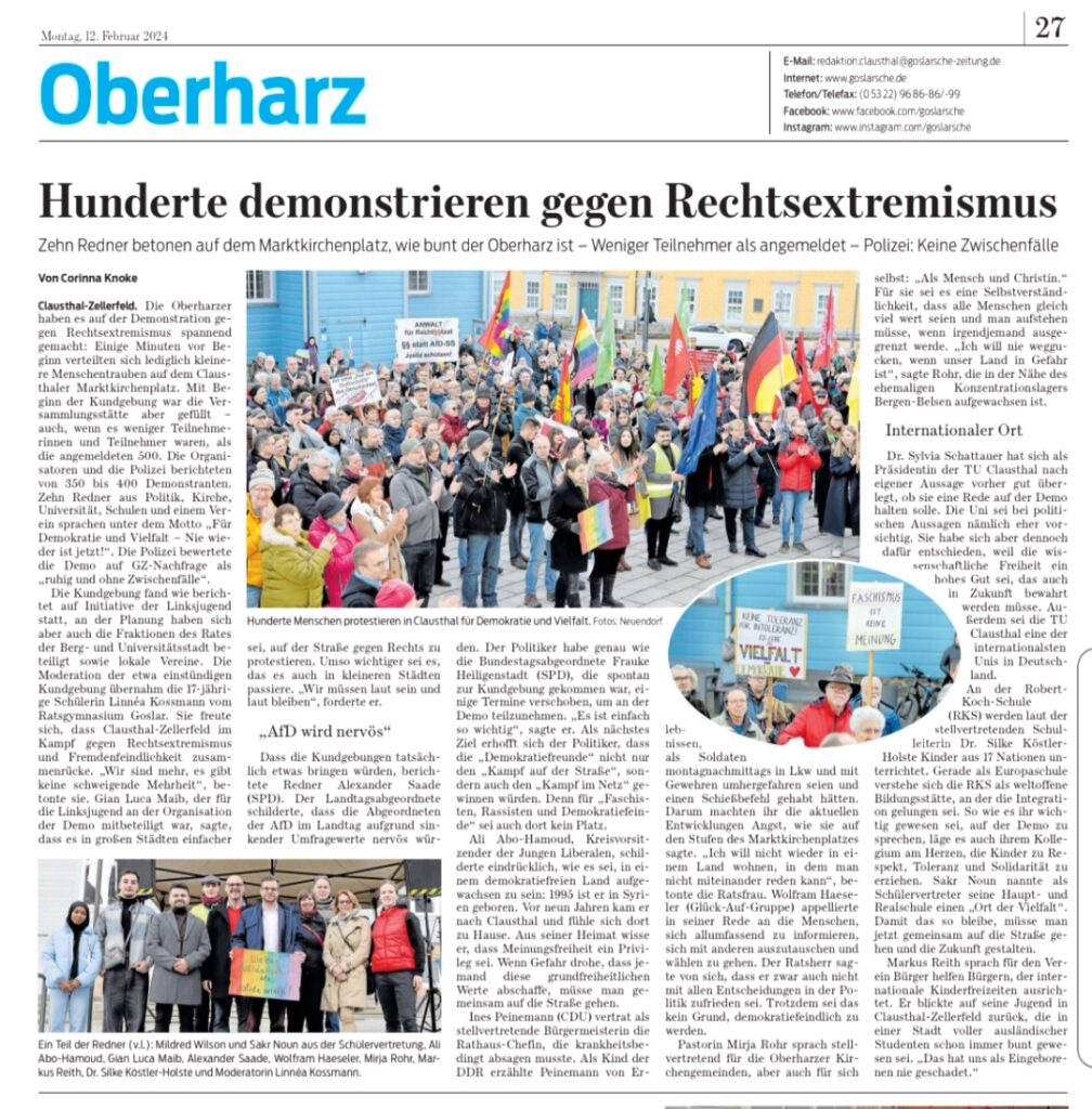 In Clausthal-Zellerfeld haben mehrere hundert Menschen auf dem Marktkirchenplatz gegen Rechtsextremismus demonstriert. Trotz kalter Temperaturen versammelten sich zahlreiche Bürgerinnen und Bürger, um ein Zeichen für Demokratie, Vielfalt und Menschenrechte zu setzen. Die Veranstalter hatten ursprünglich etwa 900 Teilnehmer erwartet, tatsächlich nahmen nach Angaben der Polizei rund 350 bis 400 Menschen an der Demonstration teil. Zwischenfälle gab es während der Veranstaltung nicht.