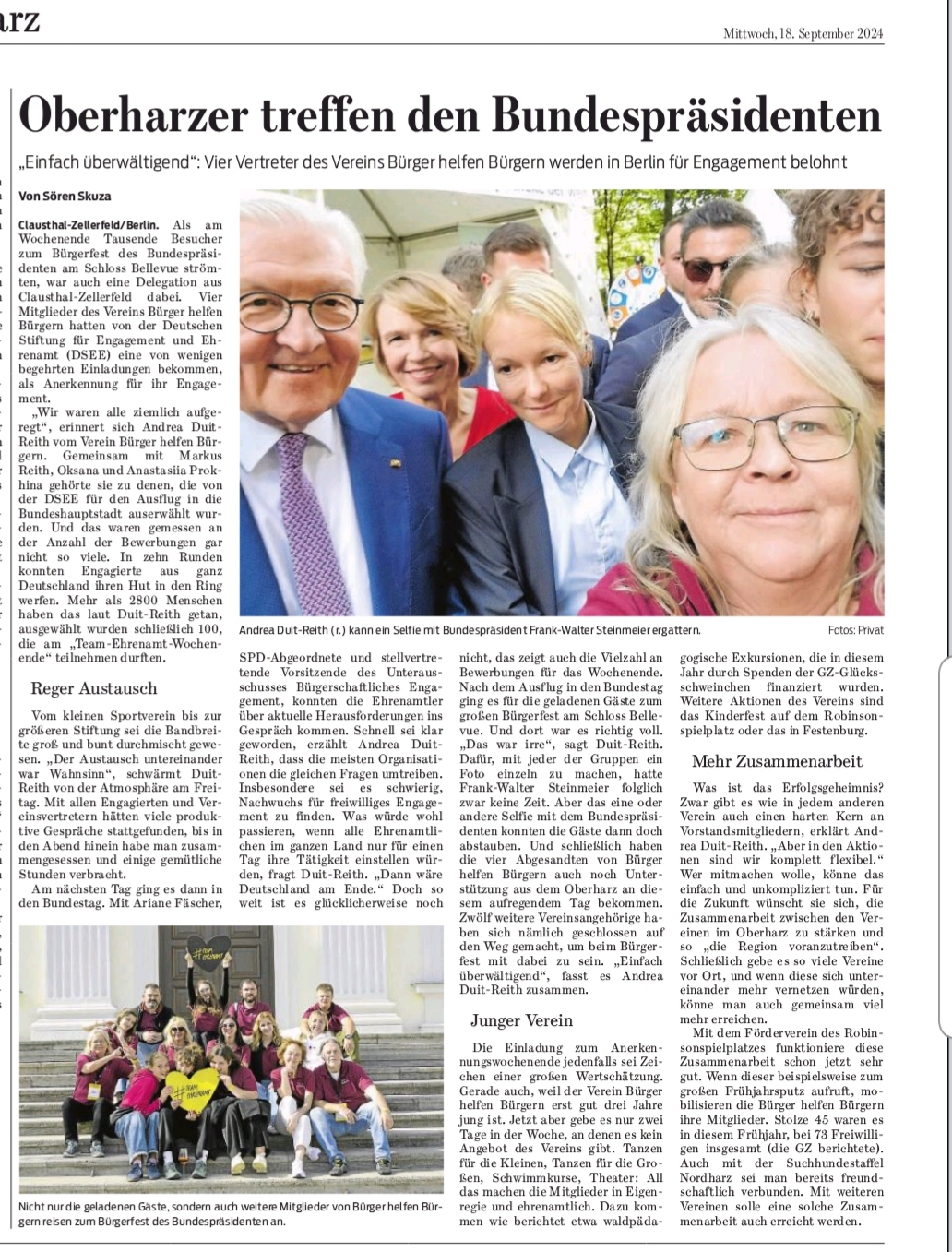 Eine besondere Auszeichnung erlebten vier Vertreter des Vereins Bürger helfen Bürgern Clausthal-Zellerfeld e.V., als sie in Berlin am Bürgerfest des Bundespräsidenten im Schloss Bellevue teilnehmen durften. Die Einladung erfolgte durch die Deutsche Stiftung für Engagement und Ehrenamt (DSEE) als Anerkennung für das langjährige und vielseitige ehrenamtliche Engagement des Vereins im Oberharz. Für die Delegation aus Clausthal-Zellerfeld war es ein unvergessliches Wochenende voller Eindrücke, Begegnungen und inspirierender Gespräche.