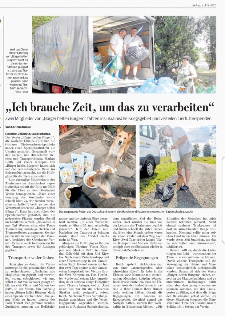 In Zusammenarbeit mit der Goslarer Ukrainehilfe und der Niedersachsen Apotheke Goslar starteten wir einen Spendenaufruf. Gesammelt wurden Katzen- und Hundefutter, Decken und Transportboxen. Die gedruckten Plakate wurden überall im Landkreis verteilt.