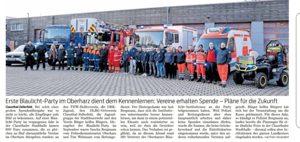 Bei der ersten Blaulicht-Party im Oberharz stand neben dem geselligen Beisammensein vor allem der Austausch zwischen den Einsatzkräften im Mittelpunkt. Vertreterinnen und Vertreter verschiedener Blaulicht-Institutionen nutzten die Gelegenheit, sich besser kennenzulernen und die Zusammenarbeit weiter zu stärken. Insgesamt konnten rund 600 Euro eingenommen und an mehrere ehrenamtliche Vereine übergeben werden.